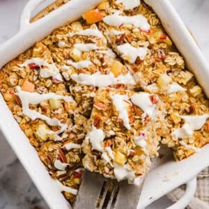 This Apple Cinnamon Baked Oatmeal is a cozy breakfast made with wholesome oats, shredded apples, and warm spices while naturally sweetened with maple syrup and plump raisins! We also topped this with crunchy pecans and a delicious maple cream cheese glaze!